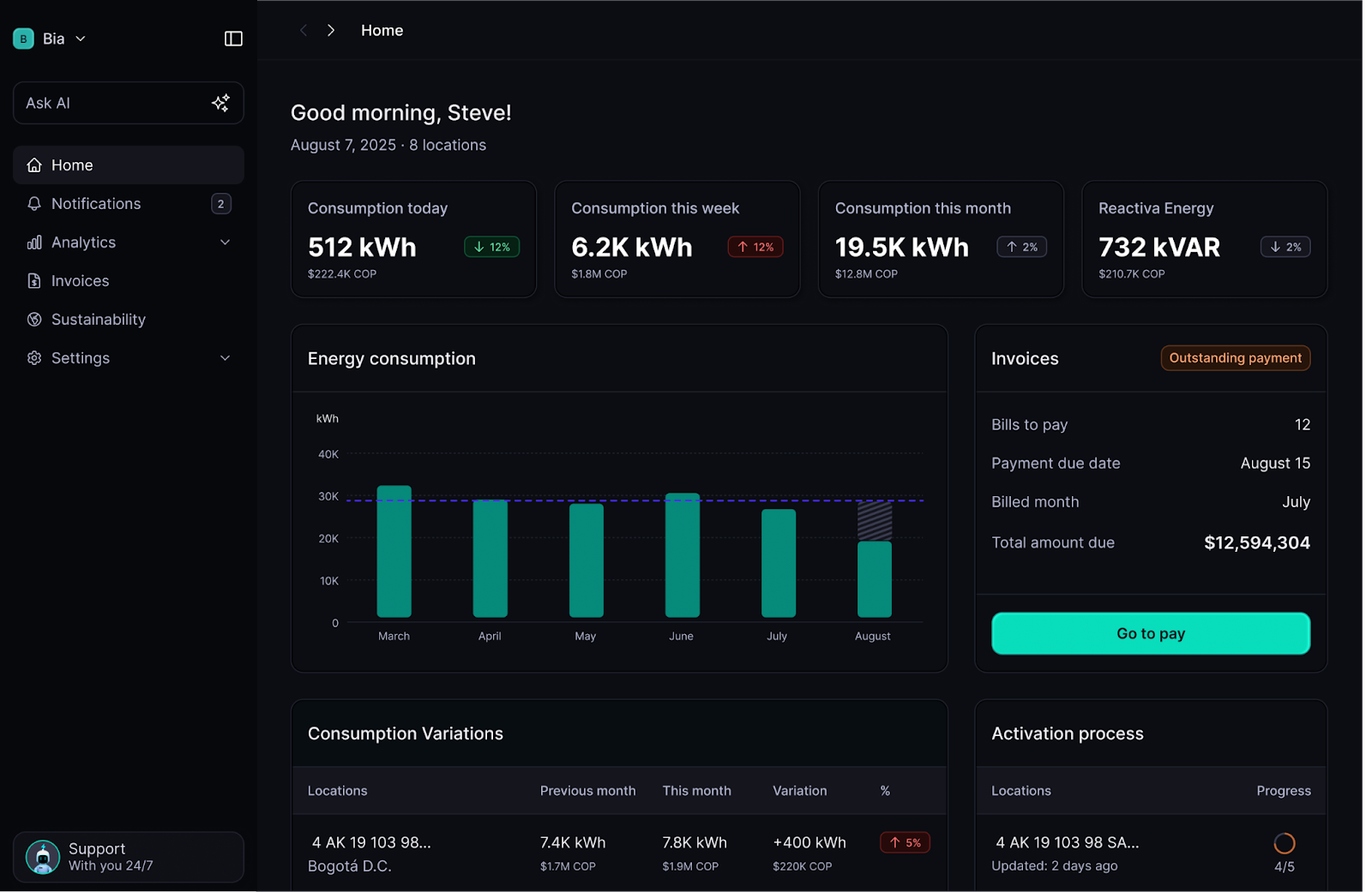 That’s the gap Bia seized. We built a modern, customer-obsessed energy retailer that gives businesses real visibility: advanced analytics, smart digital billing, and renewable energy certificates. It’s the first time businesses in Colombia see energy as something they can manage, not just endure.