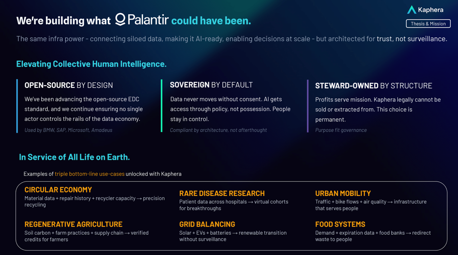 3) How Kaphera positions itself as the philosophical opposite of Palantir.